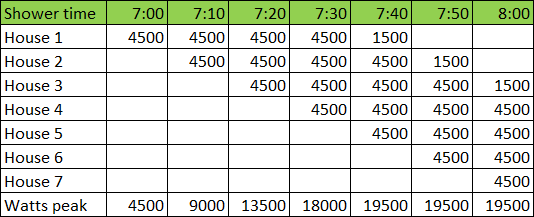 As you can see, the peak usage at any given time in this staggered scenario is 15,00 watts. Of course, if all seven houses decided to shower at 7am or at 8am then the peak use would in fact be 105,000 watts.